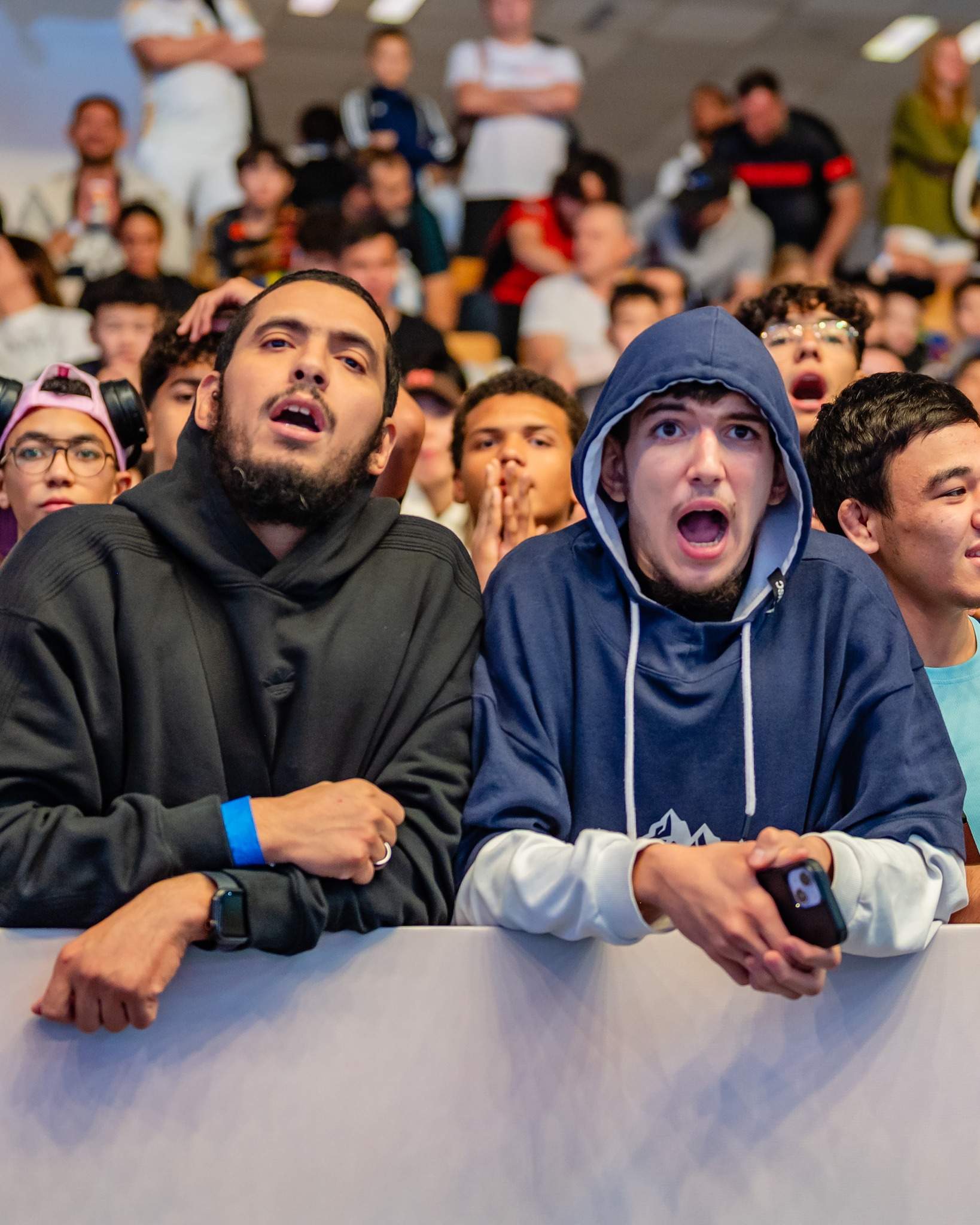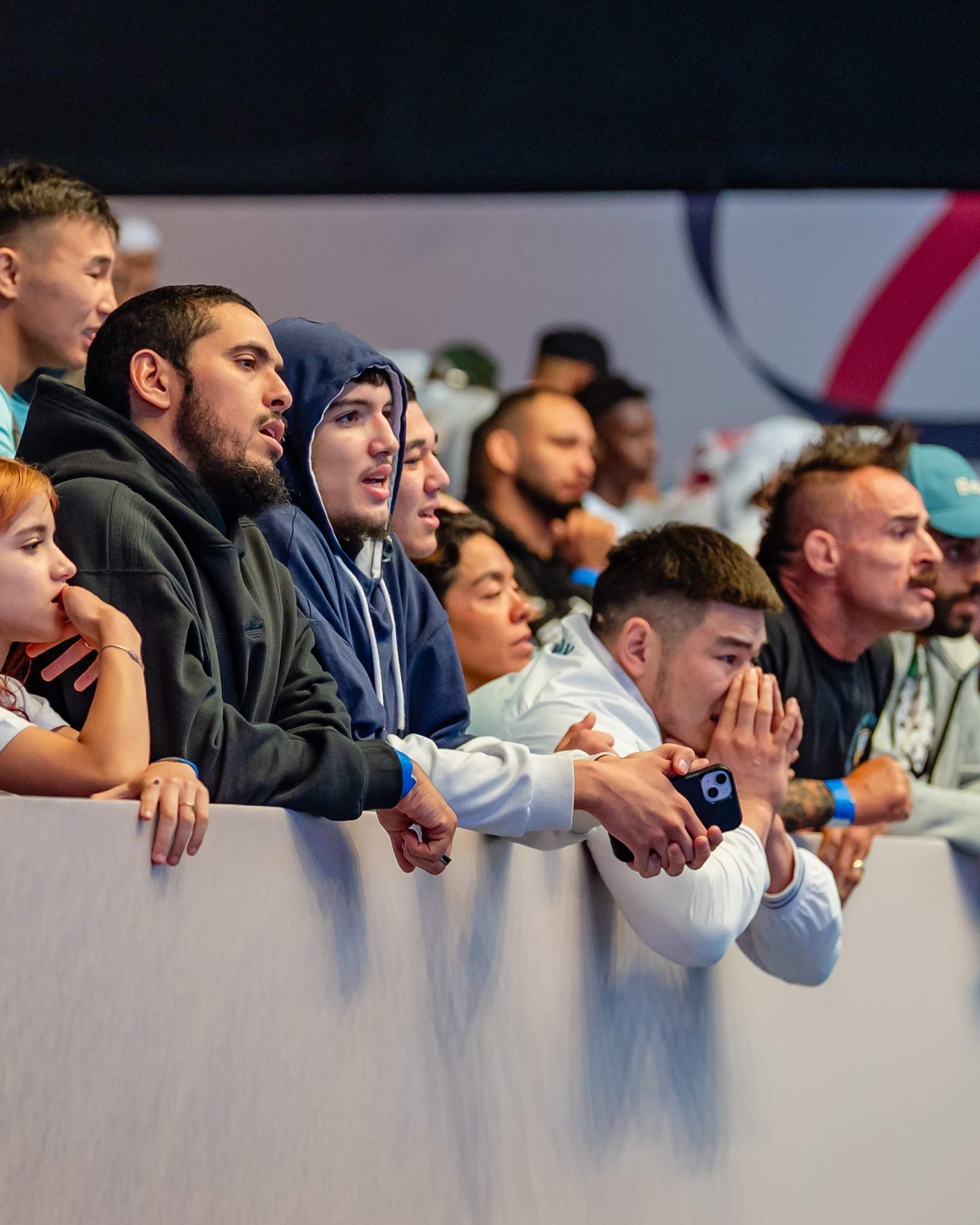 Atom Jiu Jitsu coach passionately cheering from the stands at the Kids Jiu Jitsu Worlds in Abu Dhabi