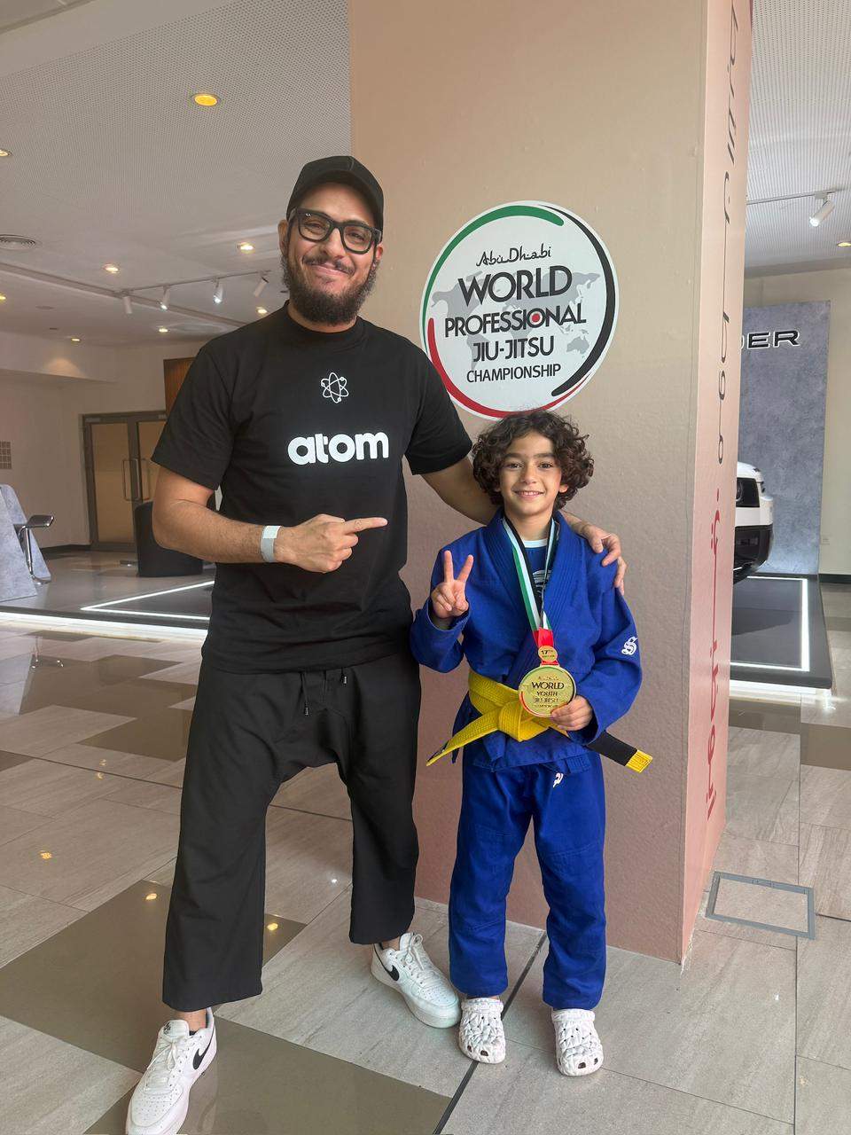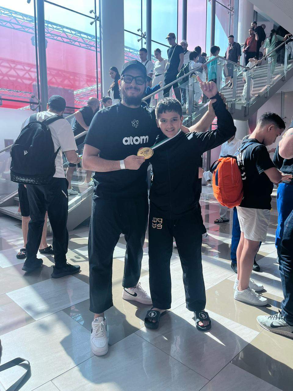 Atom Jiu Jitsu coach celebrating with a young athlete holding his gold medal at the Kids Jiu Jitsu Worlds in Abu Dhabi