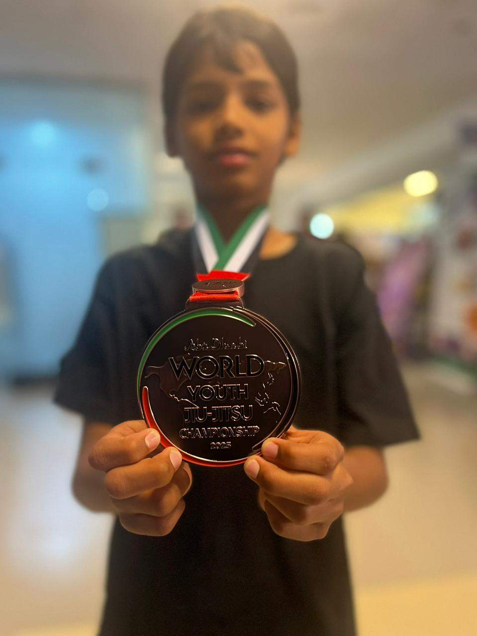 Young Atom Jiu Jitsu athlete Mohamed Syoud in a blue gi flexing and showing his gold medal at the World Youth Jiu Jitsu Championships